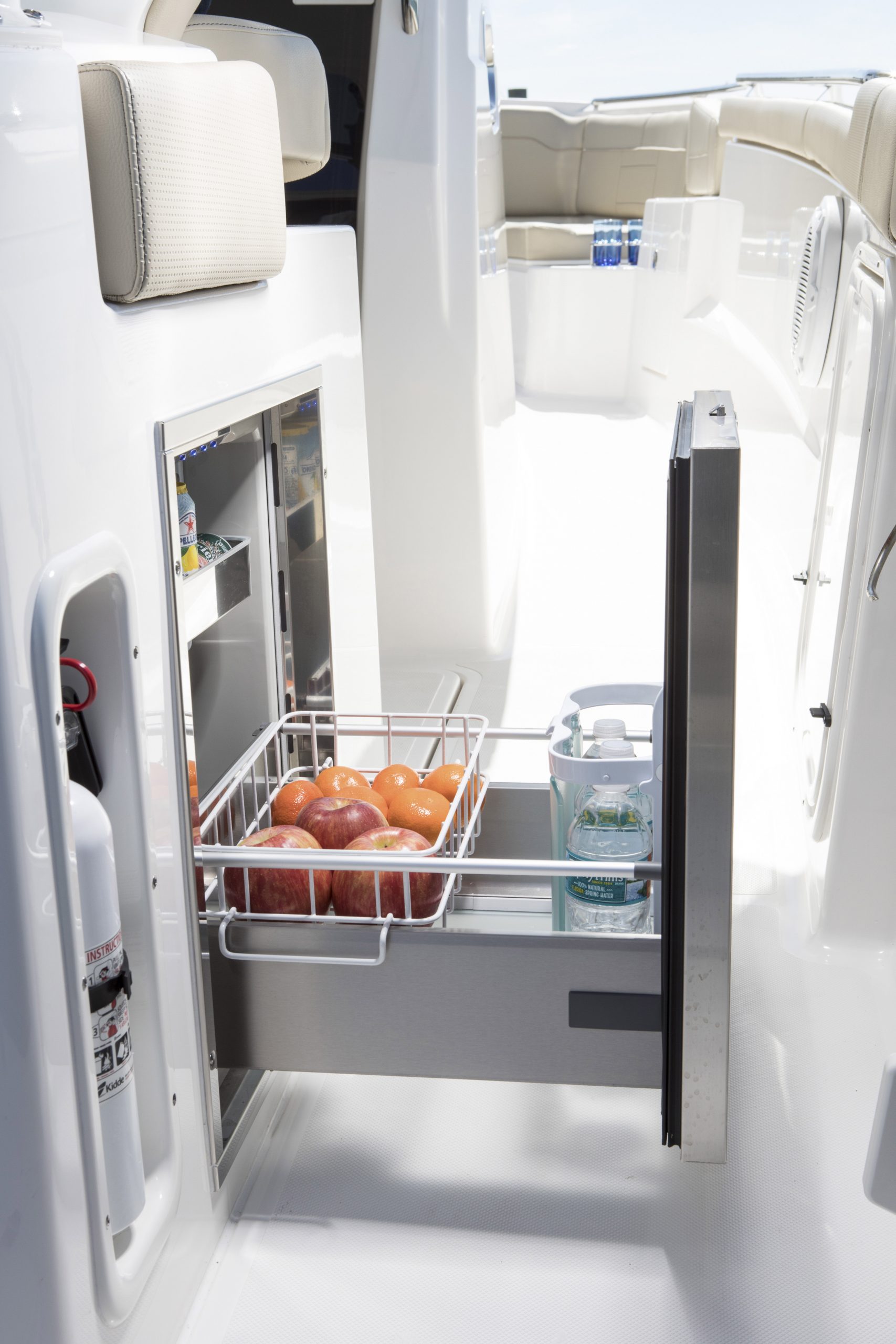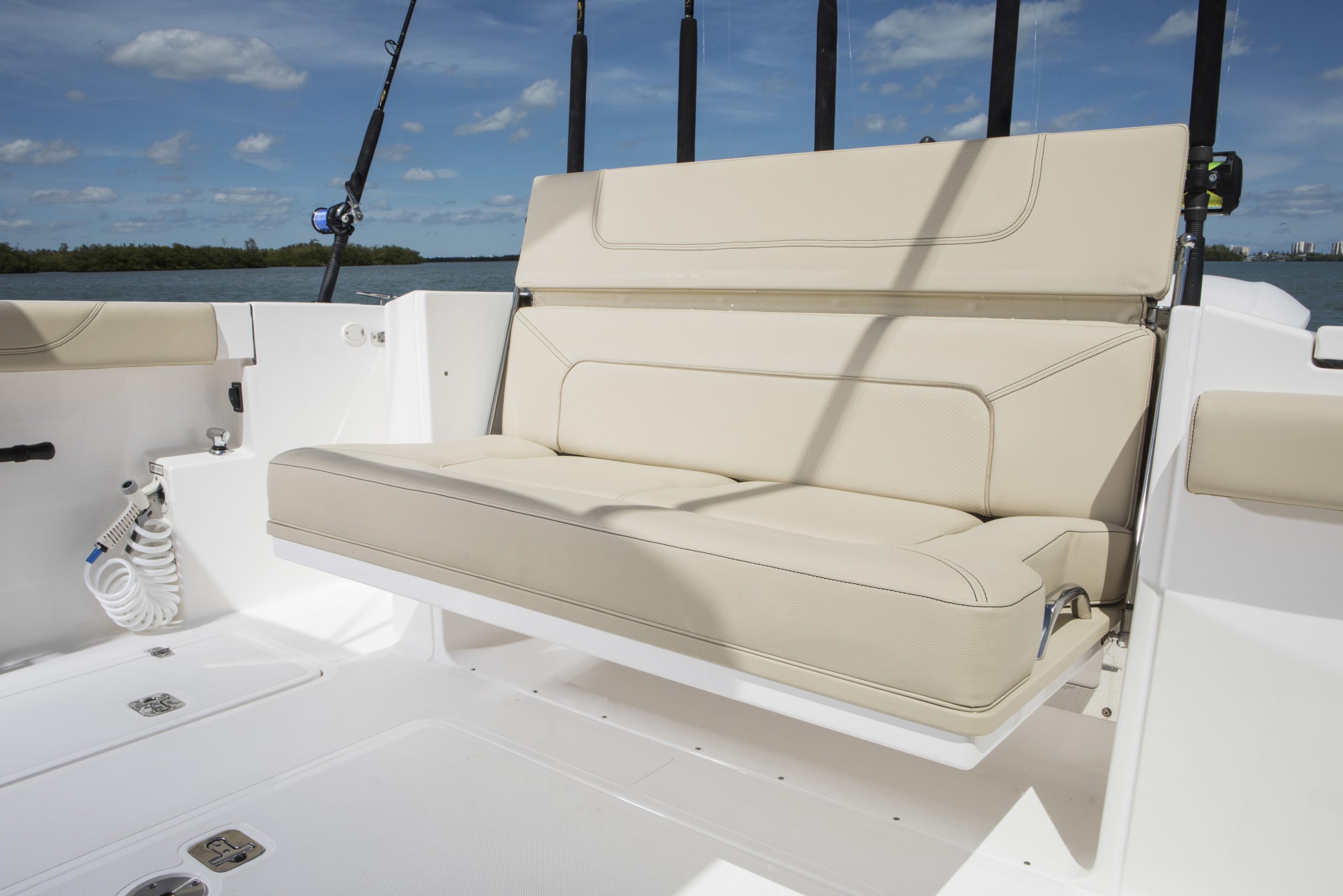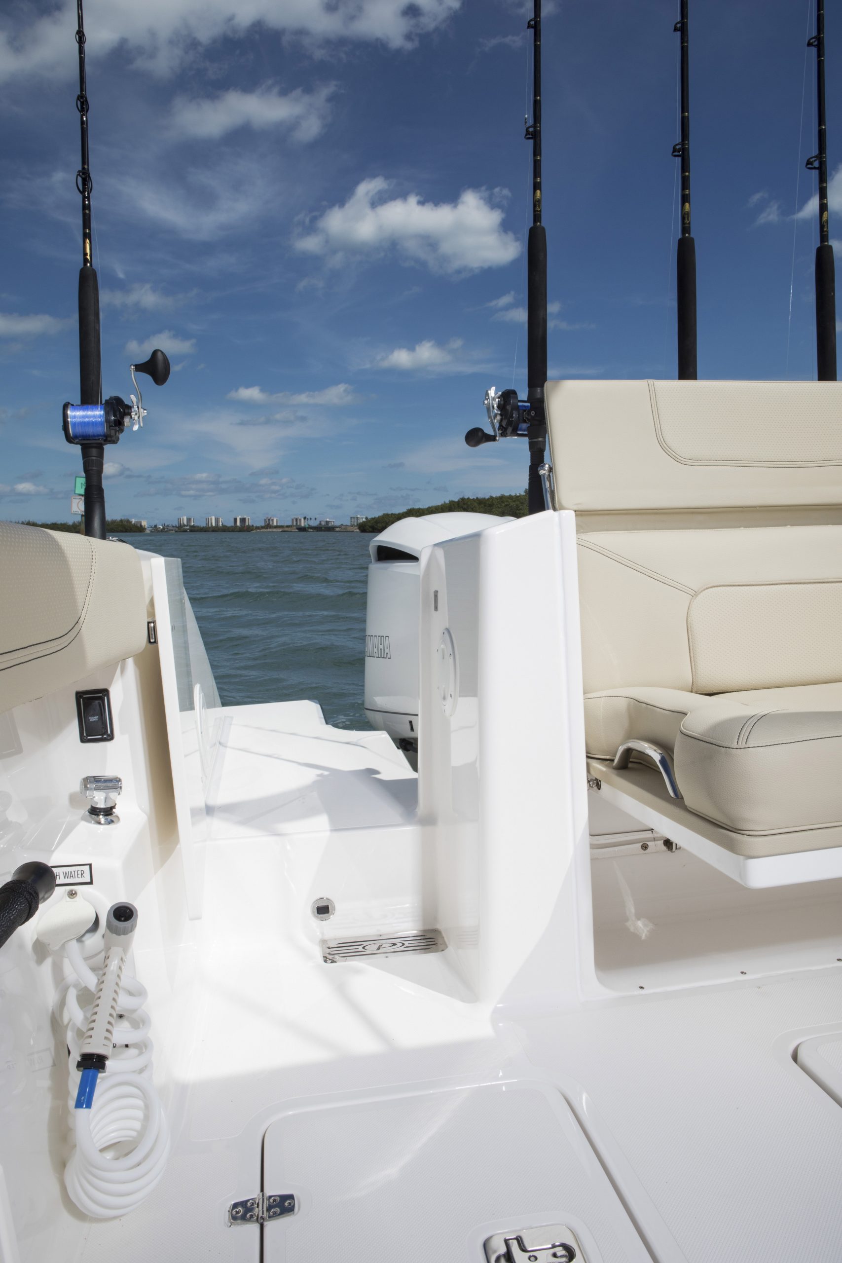 Une couchette pour deux personnes se transforme en un siège arrière avec de grandes zones de stockage ouvertes bâbord et tribord. Une vanité avec évier pour se rafraîchir. Le cockpit arrière permet une pêche sérieuse et avec les sièges rabattables avant et arrière, se convertit rapidement en un espace social.