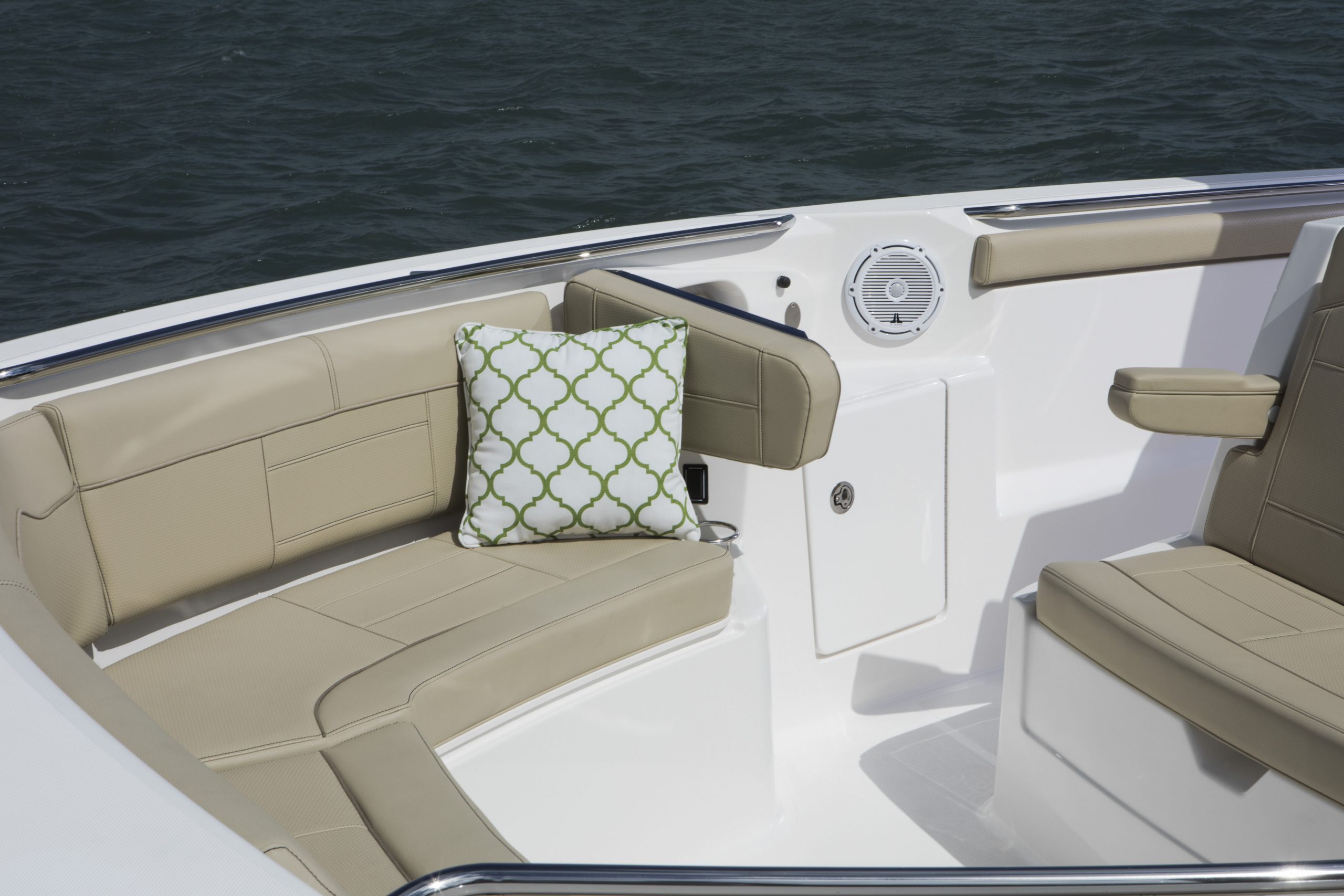 Le style extérieur est complété par un salon enveloppant la proue, juste en face des sièges orientés vers l’avant dans la console.