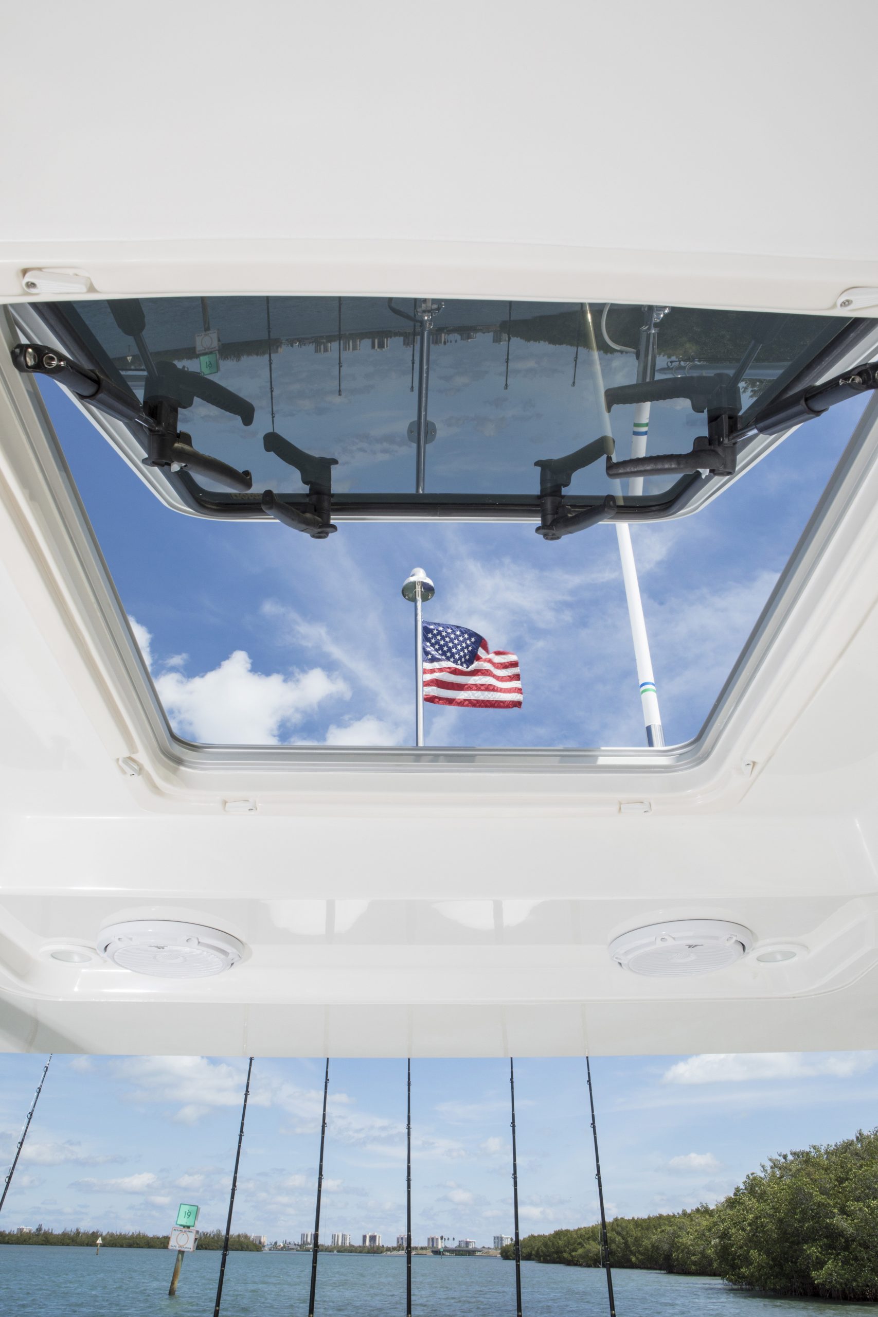 L’athlétique 32 comprend un système de toit rigide et de pare-brise en fibre de verre intégré, surdimensionné, une ligne de berline classique mise à jour, un système d’ancrage traversant et des extensions de tableau arrière intégrées.
